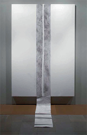 Los lienzos blancos, con telas que superan el bastidor e intervienen el espacio. La suciedad de las pisadas como historia y vida, el oleo blanco como